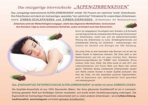 DAS EINZIGARTIGE ÖSTERREICHISCHE ALPEN-ZIRBENKISSEN ist befüllt mit reinen Zirbenflocken. Die Qualitäts-Kissenhülle ist aus 100 % Baumwolle (Mako). Der feine glänzende Qualitätsstoff ist ein in Leinwandbindung gewebter Stoff aus feinfädigen Garnen verarbeitet u. wurde einem Veredlungsvorgang unterzogen.