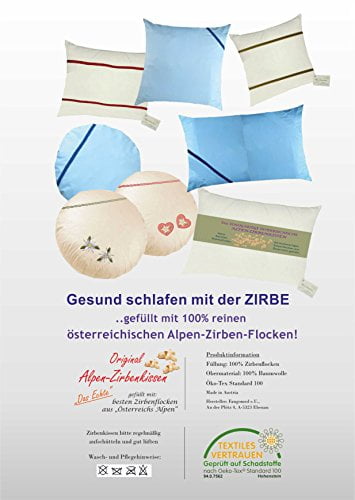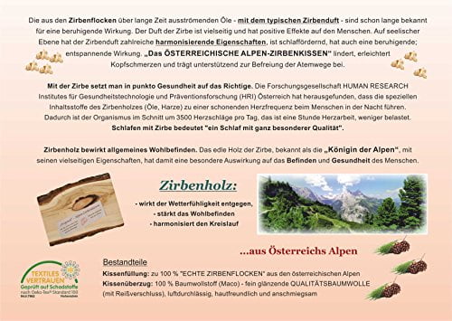 „Das ECHTE“ ORIGINAL ALPEN-ZIRBENKISSEN lindert, erleichtert Kopfschmerzen u. trägt unterstützend zur Befreiung der Atemwege bei. Mit der Zirbe setzt man in punkto Gesundheit auf das Richtige. Die Forschungsgesellschaft HUMAN RESEARCH Institutes für Gesundheitstechnologie und Präventionsforschung (HRI) Österreich hat herausgefunden, dass die speziellen Inhaltsstoffe des Zirbenholzes (Öle, Harze) zu einer schonenden Herzfrequenz beim Menschen i. d. Nacht führen.