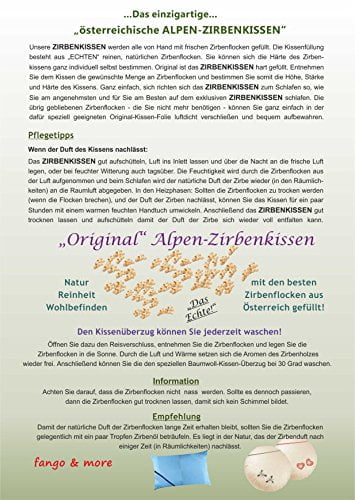Die Eigenschaften der hochwertigen Kissenhülle unterscheidet sich zu vielen anderen Zirbenkissen – ist luftdurchlässig, hautfreundlich, anschmiegsam u. bietet optimalen Schlafkomfort. Die aus den Zirbenflocken über lange Zeit ausströmenden Öle, m. d. typischen Zirbenduft, sind schon lange bekannt für eine beruhigende Wirkung.